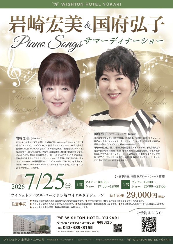 千葉・ウィシュトンホテル・ユーカリ (千葉県佐倉市)岩崎宏美&国府弘子Piano Songs サマーディナーショー